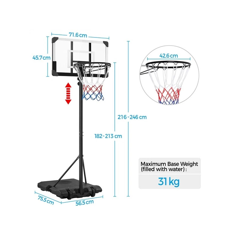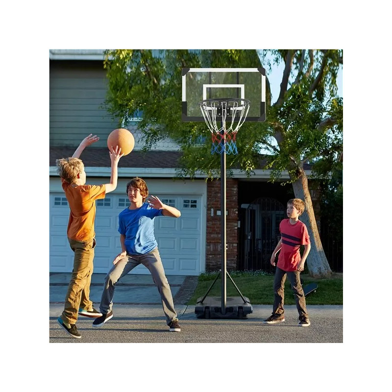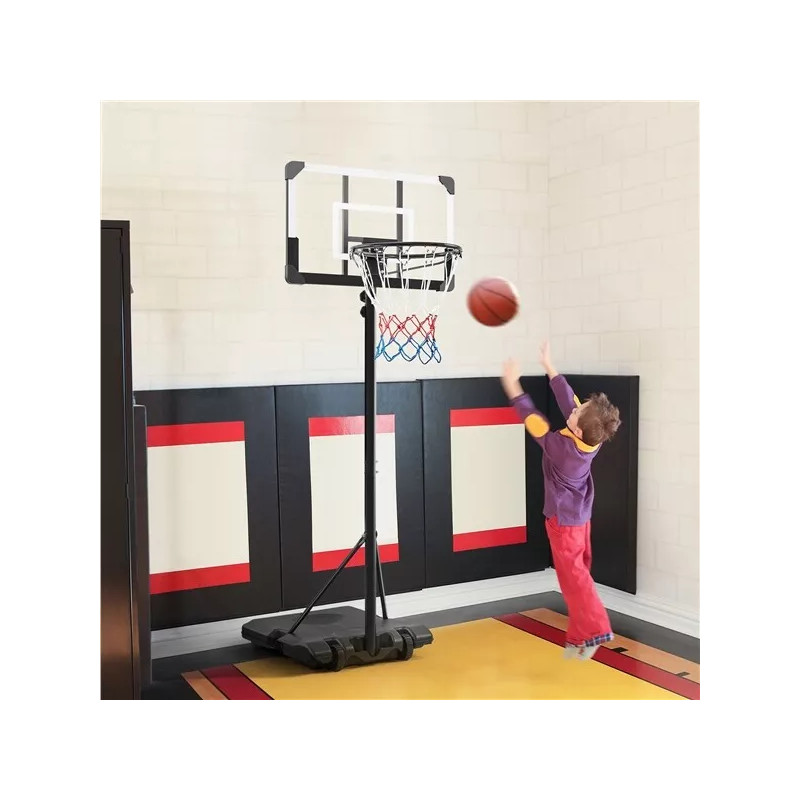 Výšku koše lze snadno nastavit pomocí otočného kolečka od 182 cm do 212 cm a je vhodný pro hráče ve věku 4 až 10 let. Základna je vybavena dvěma kolečky pro lepší mobilitu. Díky práškově lakovanému kovovému stojanu a odolné zadní desce je tento volně stojící basketbalový koš odolný a odolný vůči povětrnostním vlivům.