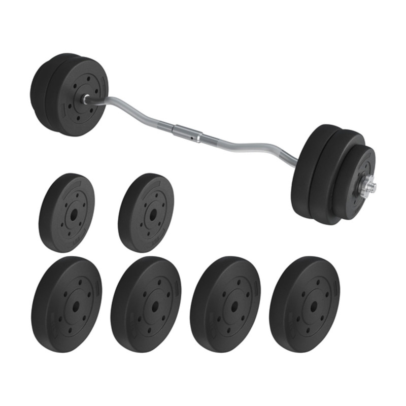 Desky jsou vyrobeny z masivního betonu a tyč na bicepsy je vyrobena z odolného kovu s chromovanou povrchovou úpravou. Vroubkované části zabraňují náhodnému uvolnění v důsledku pocení. Hvězdicové objímky zajišťují bezpečné použití. Tato sada je vhodná pro silový trénink, jako jsou bicepsové zdvihy, přítahy ve stoje, francouzský press, skullscrish a podobně.