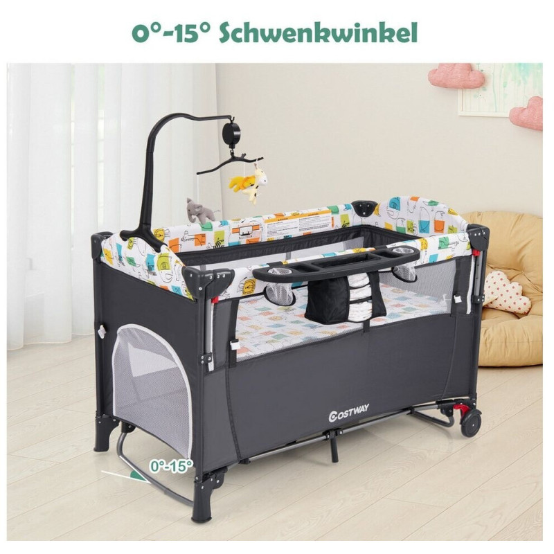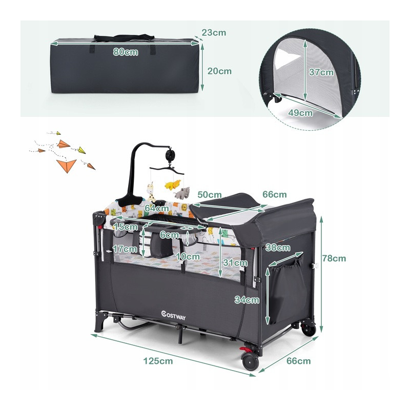 Díky multifunkčnímu designu může tato postýlka sloužit jako stolek pro výměnu plen, místo na spaní a centrum aktivit. Područku lze nastavit ve 4 výškách v závislosti na výšce postele. Vyrobeny z vysoce kvalitní trubky se 7bodovou podporou, mají stabilní konstrukci. Síťovaná tkanina nejen zajišťuje lepší ventilaci, ale také umožňuje rodičům volně pozorovat dítě. Pohodlná matrace se vyznačuje vynikající odolností proti opotřebení, absorpcí vody a antikorozní úpravou. Postýlku lze rychle složit do kompaktní velikosti a umístit do přiložené tašky na přenášení.
