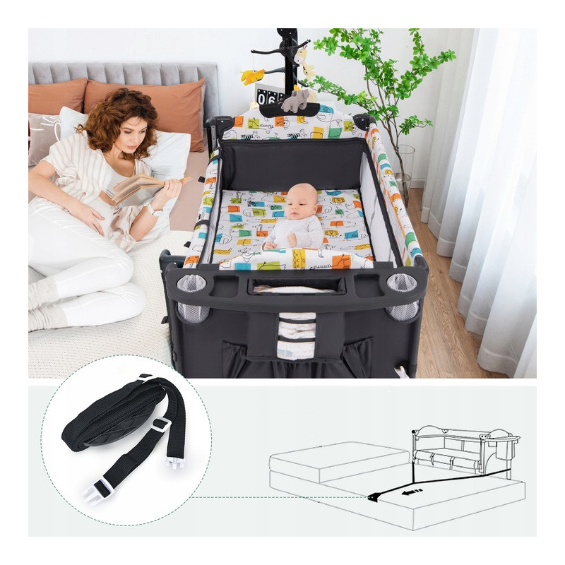 Tato postýlka k postýlce je multifunkční jednotka, která roste s vaším dítětem od narození až do batolecího věku. Kolébka typu „vše v jednom“ slouží jako postýlka, přebalovací pult, noční postýlka, ohrádka a centrum aktivit. Dodává se s bezpečnostními popruhy pro bezproblémové společné spaní a krmení.
