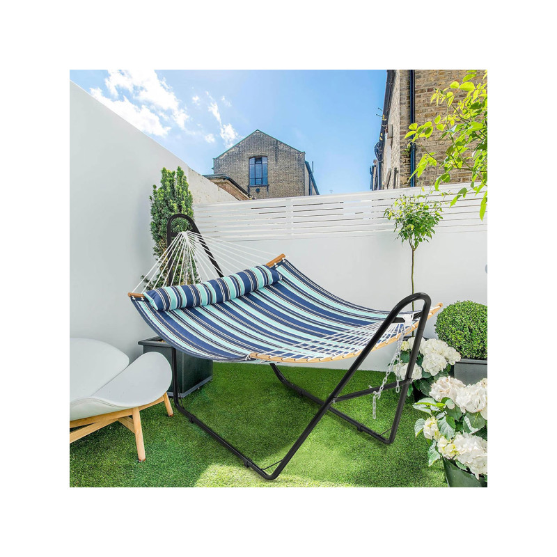 Pro 2-3 osoby: sada se skládá z látkové houpací sítě (190 cm x 140 cm) a robustního kovového rámu. Tato houpací síť je ideální pro odpočinek s přáteli nebo rodinou až pro 3 osoby.