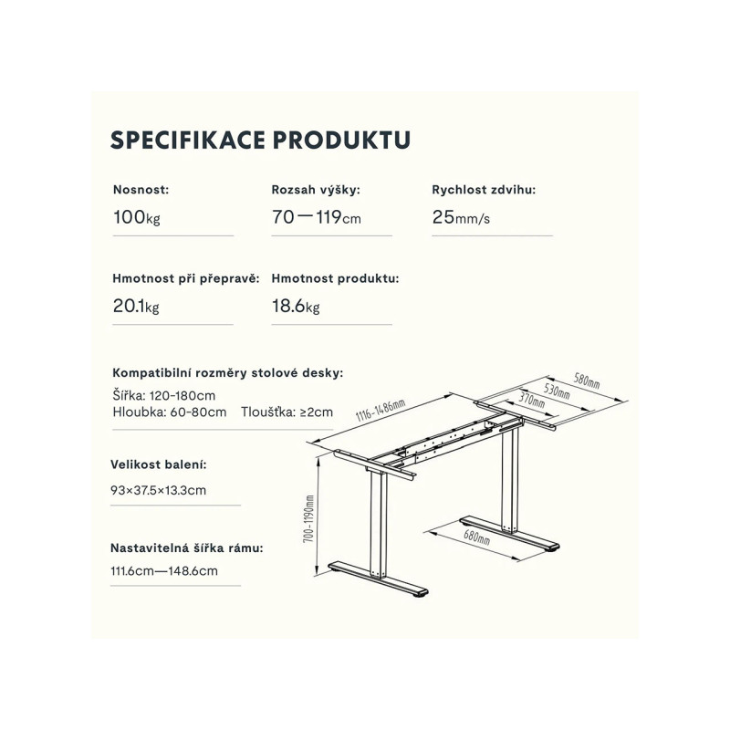 Tento výškově nastavitelný stůl je vybaven systémem dvojitých motorů, který zajišťuje větší stabilitu a účinnost, s maximální rychlostí až 25 mm/s.