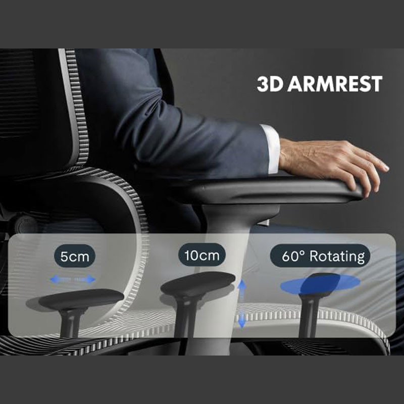 DYNAMICKÝ SYSTÉM SLEDOVÁNÍ Opěradlo a sedák křesla jsou vyrobeny ze síťoviny německé výroby, která se pohybuje spolu s vašimi zády, a nabízí tak nepřetržitou oporu a účinně zmírňuje bolesti a tlak v zádech. Síťovina je navíc prodyšná, pevná a odolná vůči deformaci. 3D područky lze nastavit svisle, vodorovně a dopředu i dozadu, čímž poskytují oporu pro vaše paže při práci i odpočinku, uvolňují napětí ramenních svalů a nabízejí maximální pohodlí.