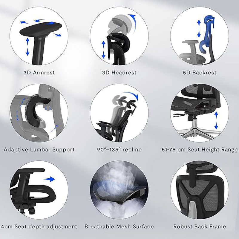 Tato kancelářská židle se vyznačuje adaptivní bederní opěrkou, nastavitelnou opěrkou hlavy, 3D područkami a odolnými, tichými kolečky, která poskytují trvalé pohodlí i po delším každodenním používání.