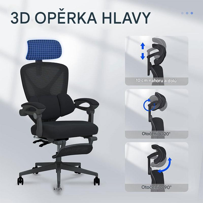 3D opěrka hlavy pro flexibilní podporu krku: Inovativní 3D opěrka hlavy je výškově nastavitelná, má dva klouby, umožňuje otáčení až o 120° a lze ji naklonit v úhlu až 90°. Dokonale se přizpůsobí různým velikostem těla, polohám při sezení a scénářům použití – ať už pracujete, čtete nebo odpočíváte.