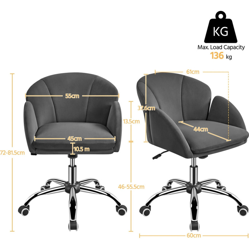 Kombinace sametové textury a kovu dodává této otočné židli jedinečnou eleganci. Díky širokému sedáku, měkkému opěradlu a područkám nabízí tato kancelářská židle výjimečné pohodlí. Pro ještě větší pohodlí si můžete nastavit výšku sedáku a úhel opěradla. Tato rozkládací židle má pět koleček pro tichý a beztlaký pohyb, což zajišťuje klidné pracovní i herní prostředí.
