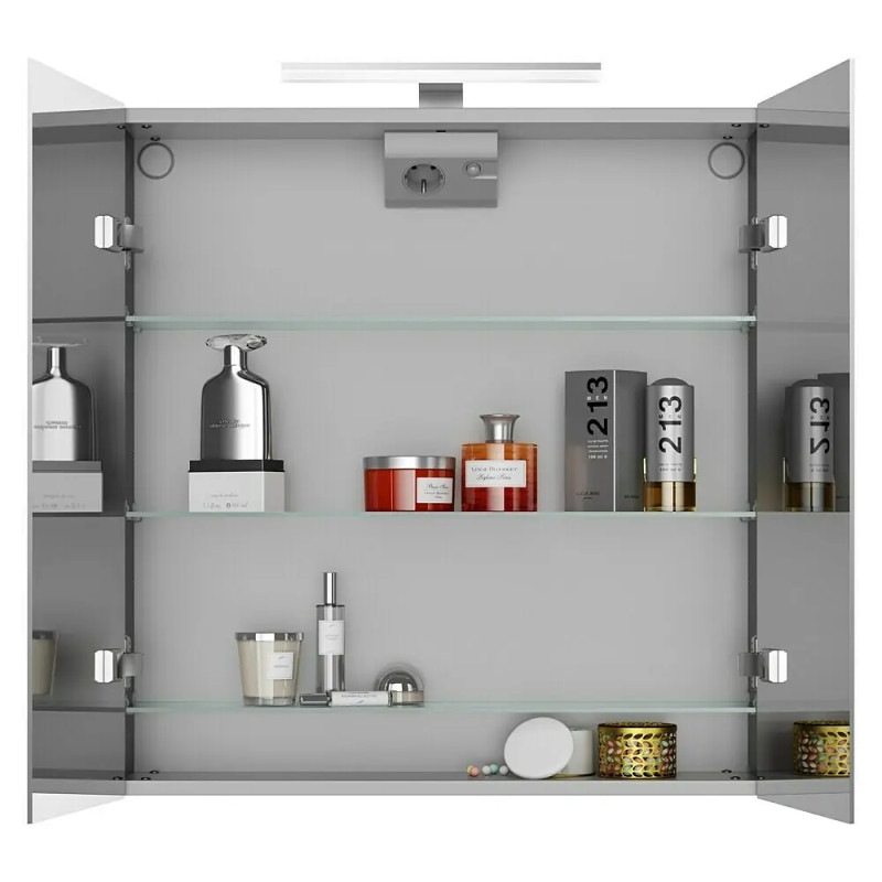 Zrcadlová skříňka Aquila LED zaujme svým moderním designem a zároveň vytváří v koupelně další úložný prostor. Za třemi zrcadlovými dvířky s funkcí tlumeného zavírání se skrývá dostatek prostoru pro kosmetiku a toaletní potřeby. Bílý korpus se svými čistými liniemi a moderním vzhledem se hodí do každé koupelny. Tři vestavěná LED bodová světla poskytují jasné denní světlo a vytvářejí příjemnou atmosféru. Zrcadlová skříňka má šest skleněných polic a kombinaci vypínače a zásuvky. Model se dodává smontovaný.