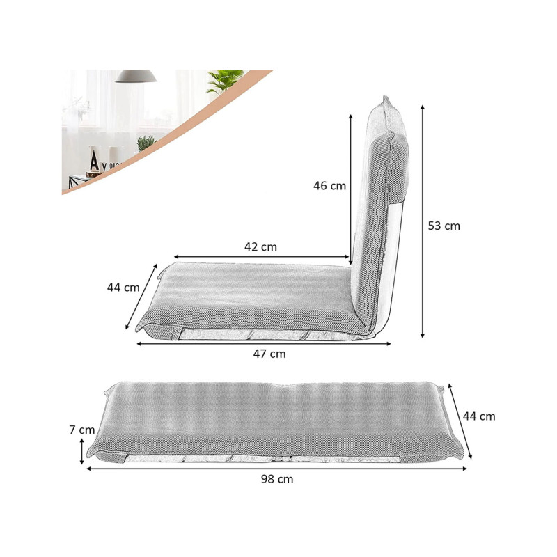 Tato superlehká a snadno přenosná podlahová židle je ideální pro mnoho aktivit při sezení, jako je čtení, hraní, meditace atd. Díky nastavitelnému opěradlu podepřenému pevným kovovým rámem si můžete nastavit úhel sklonu a sedět v uvolněné poloze celé hodiny.