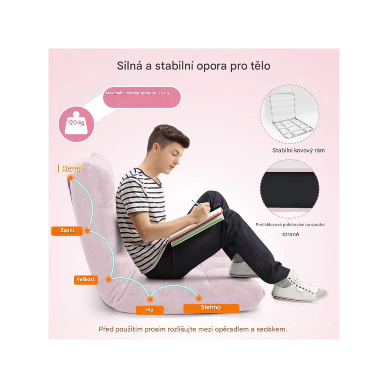Tato superlehká a snadno přenosná podlahová židle je ideální pro mnoho aktivit při sezení, jako je čtení, hraní, meditace atd. Díky nastavitelnému opěradlu podepřenému pevným kovovým rámem si můžete nastavit úhel sklonu a sedět v uvolněné poloze celé hodiny.