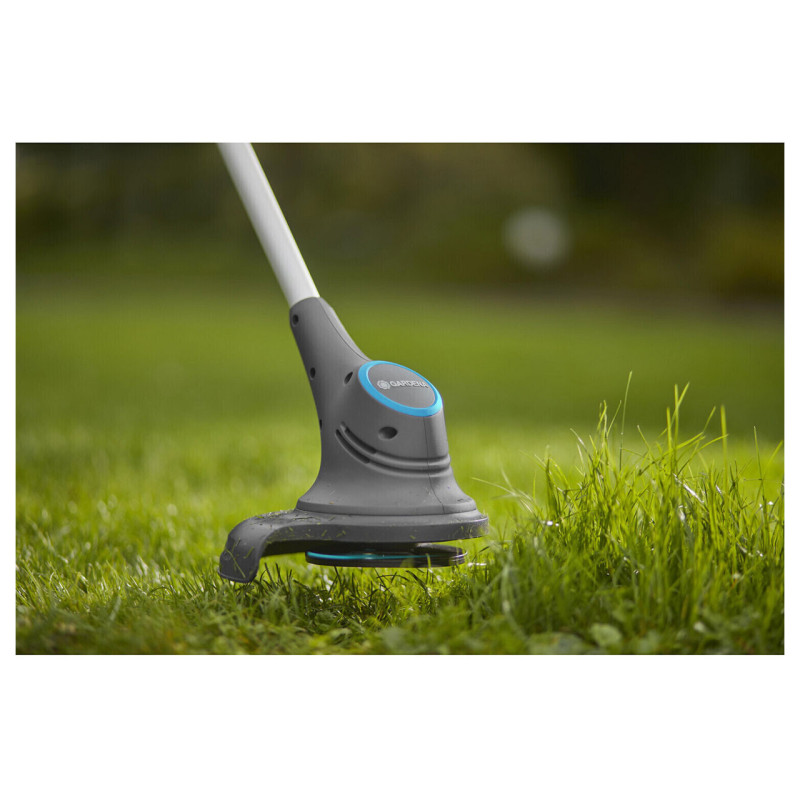 Solo akumulátorový vyžínač SmallCut 23/18V P4A od společnosti GARDENA je obzvláště lehký a výkonný. Nízká hmotnost 1,6 kg bez baterie v kombinaci s pohodlnou manipulací umožňuje snadné zastřihávání okrajů trávníku. Velká rukojeť a přední přídavná rukojeť zajišťují úspěšnou ergonomii ve vzpřímené pracovní poloze. Řezy jsou přesné, efektivní a čisté díky plastovým nožům RotorCut s pracovní šířkou 23 cm.