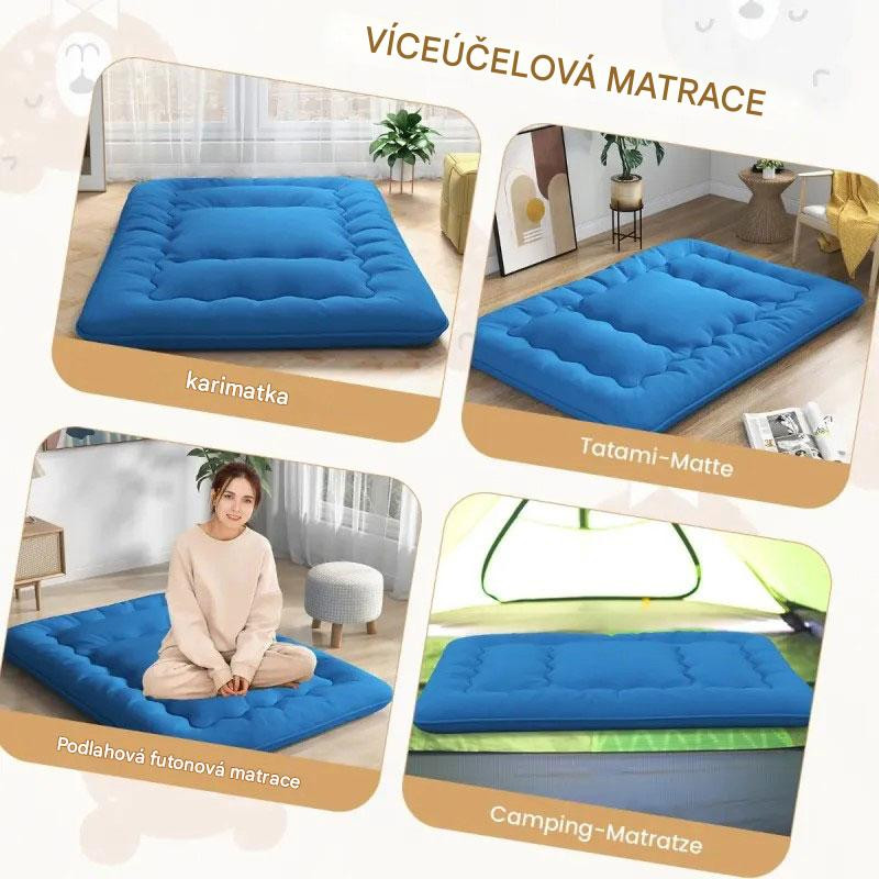 Futonová matrace je multifunkční produkt, který lze použít jako podlahovou matraci, tatami, dětskou hrací podložku, karimatku nebo kempingovou matraci.