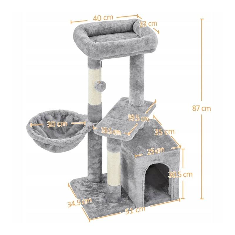 Toto škrabadlo o rozměrech 50 cm x 34,5 cm x 87 cm se skládá z 1 vyhlídkové plošiny, 1 útulné kočičí jeskyně, 1 lehátka, 1 plošiny, 2 sisalových sloupků a 1 odnímatelného plyšového míčku.