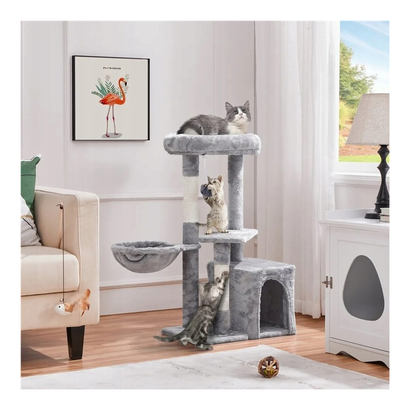 Tato velká kočičí věž poskytuje dostatek prostoru pro spaní a hraní dvou až tří koček. Dvě horní bidýlka s vyvýšeným pěnovým lemováním, prostorný byt a měkká houpací síť nabízejí mnoho útulných míst k odpočinku a lenošení pro vaše milované kočky.