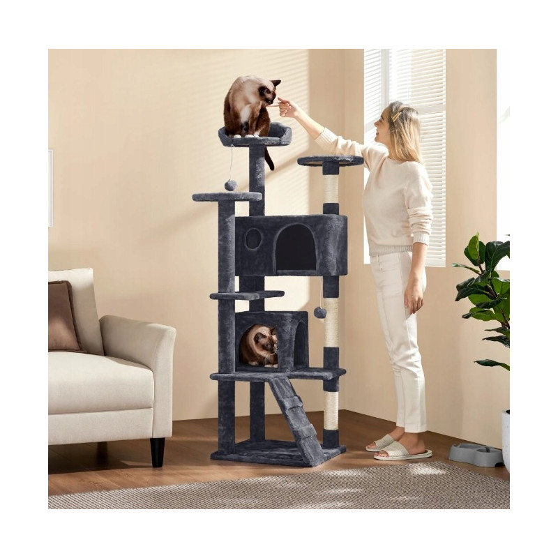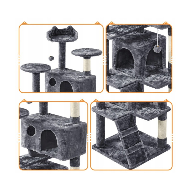 Tato velká kočičí věž poskytuje dostatek prostoru pro spaní a hraní dvou až tří koček. Dvě horní bidýlka s vyvýšeným pěnovým lemováním, prostorný byt a měkká houpací síť nabízejí mnoho útulných míst k odpočinku a lenošení pro vaše milované kočky.
