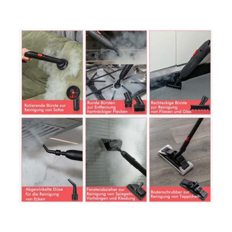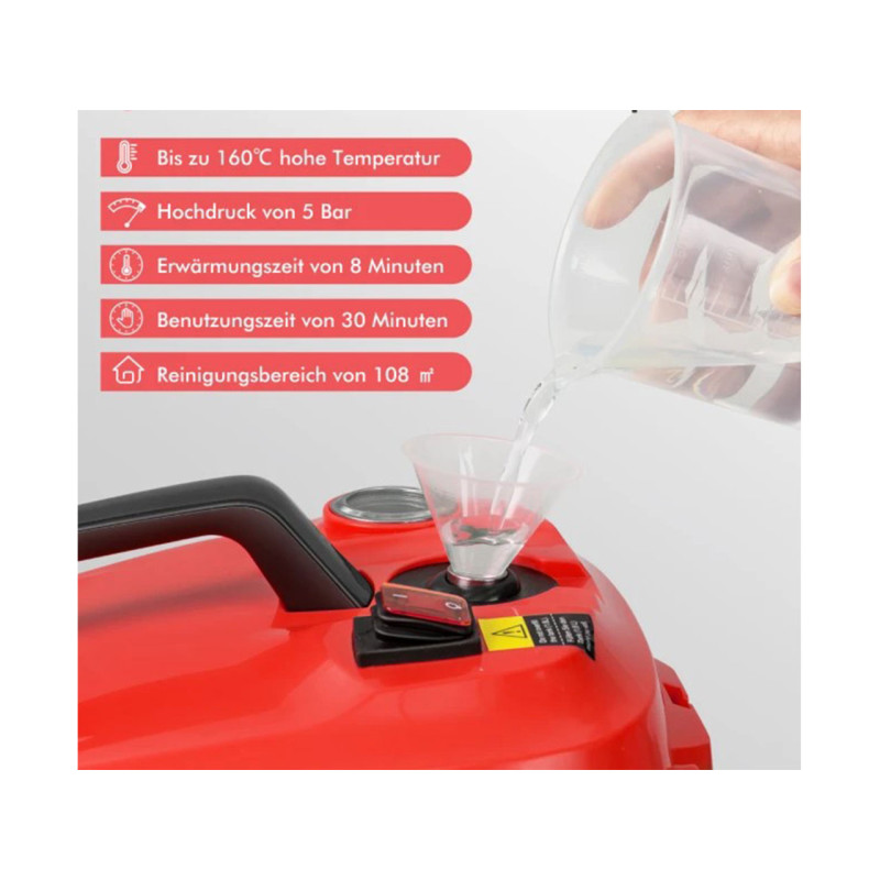 Výkonný parní čistič Costway 2000W je spolehlivé zařízení pro čištění různých povrchů ve vaší domácnosti. S teplotou páry až 160 °C a tlakem 5 barů účinně odstraňuje i ty nejodolnější nečistoty – bez použití chemikálií!