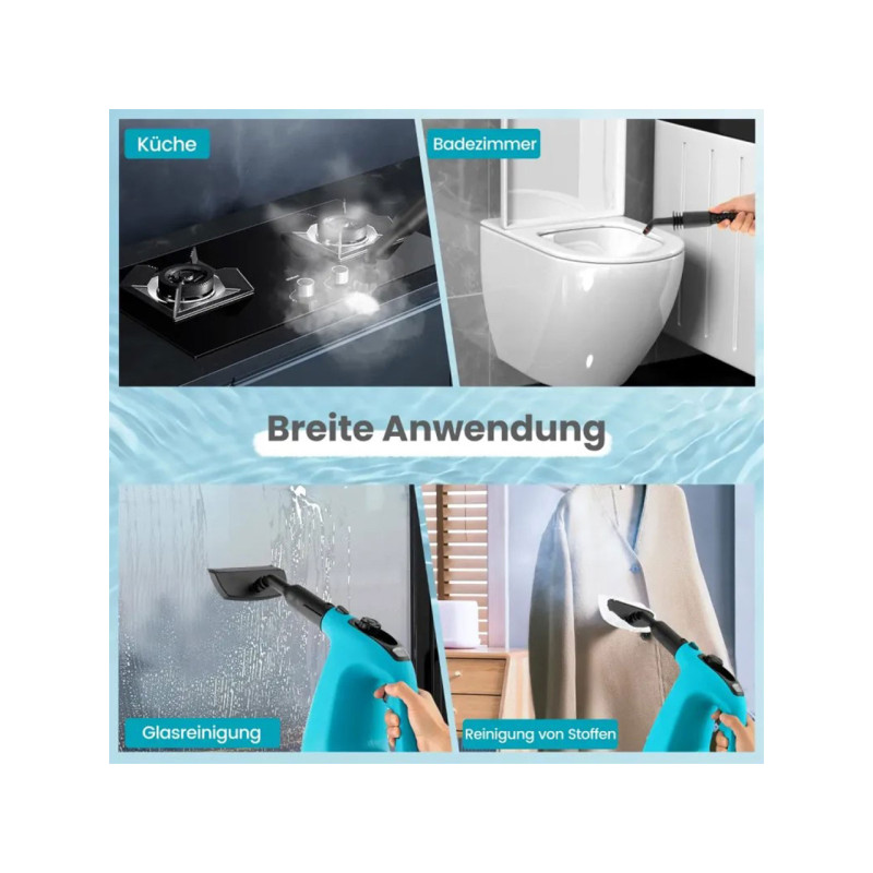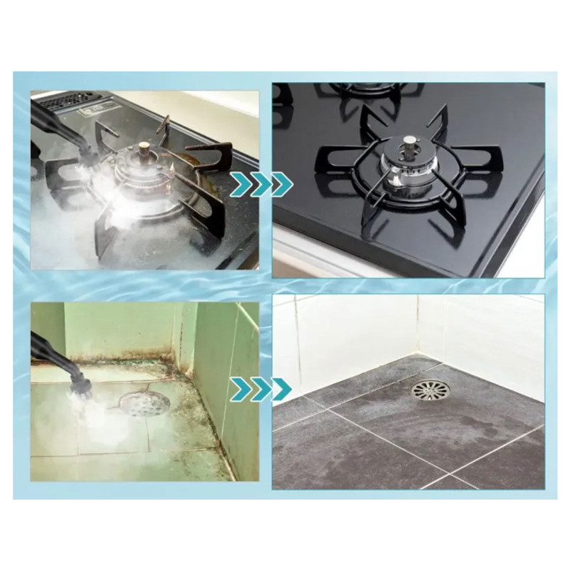 Všestranné čištění povrchů: Tento ruční napařovač lze použít k čištění různých povrchů a materiálů, jako jsou pracovní desky, kuchyňské dřezy, rošty grilů, toalety, okna, auta, podlahy nebo tkaniny. Díky přiloženým prodlužovacím hadicím a podlahovému kartáči lze přenosný ruční vysavač přeměnit na zařízení na čištění podlah.