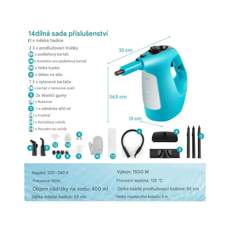Udržujte zdravé životní prostředí pro svou rodinu! Tento ruční parní čistič se dodává se 14 kusy bezplatného příslušenství, díky kterému je vhodný pro čištění různých povrchů a materiálů.