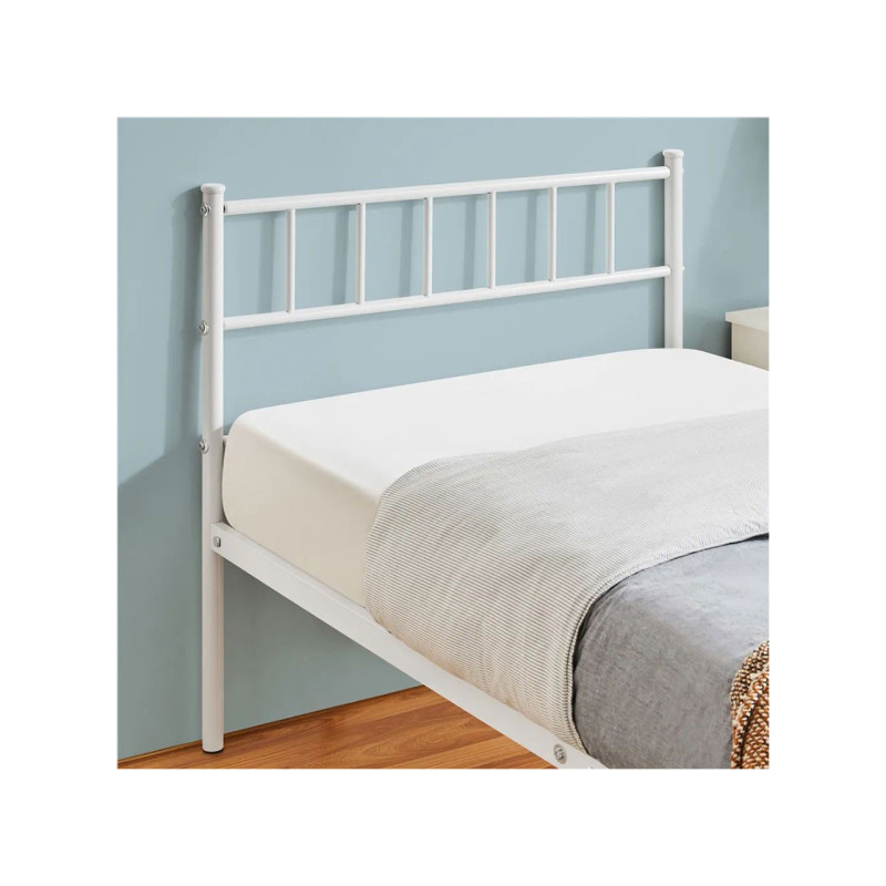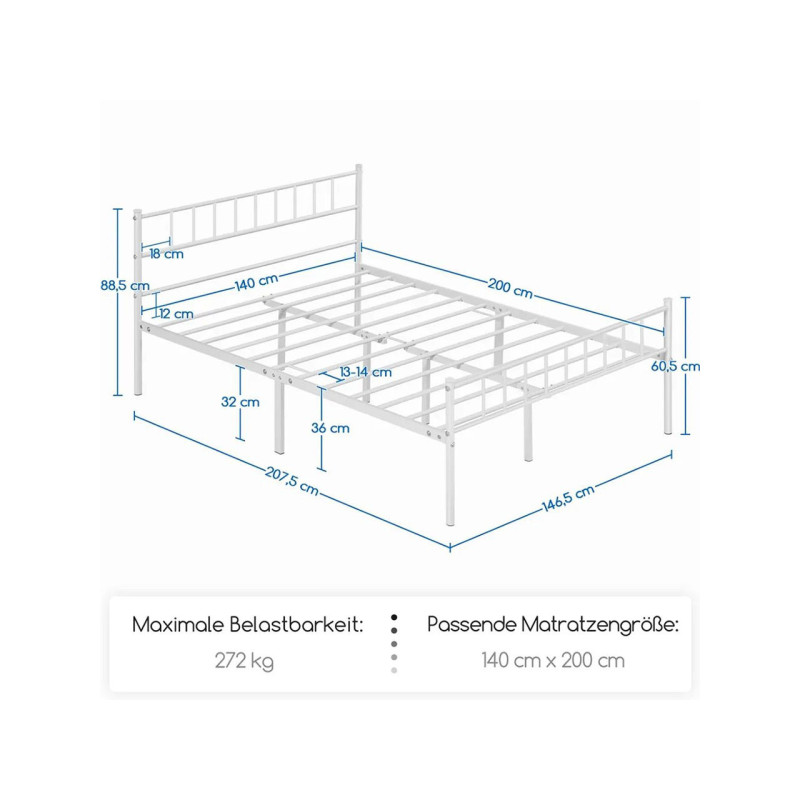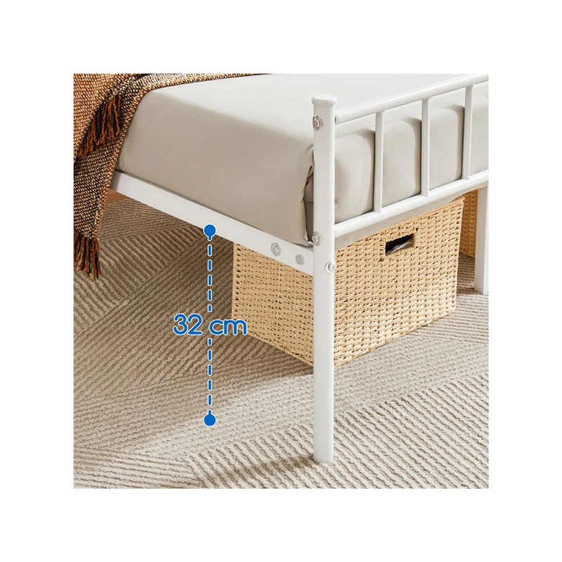 Pevné kovové nohy a pevný lamelový rošt zajišťují vysokou stabilitu a dlouhou životnost. Tento kovový rám je vhodný pro matrace standardní velikosti. Vysoké čelo a podnožka vám umožní vybrat si požadovanou tloušťku matrace. Vysoké čelo postele vám také umožní pohodlně se opřít. S polštářem za zády můžete v pohodlí odpočívat, číst knihy nebo sledovat film.
