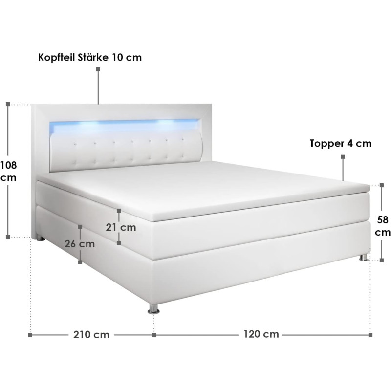 Útulná postel boxspring 120 x 200 cm bílá s 21 cm silnou pružinovou matrací (H3) a 4 cm silným topperem; komfortní výška ležení 58 cm ideální pro dospělé a seniory