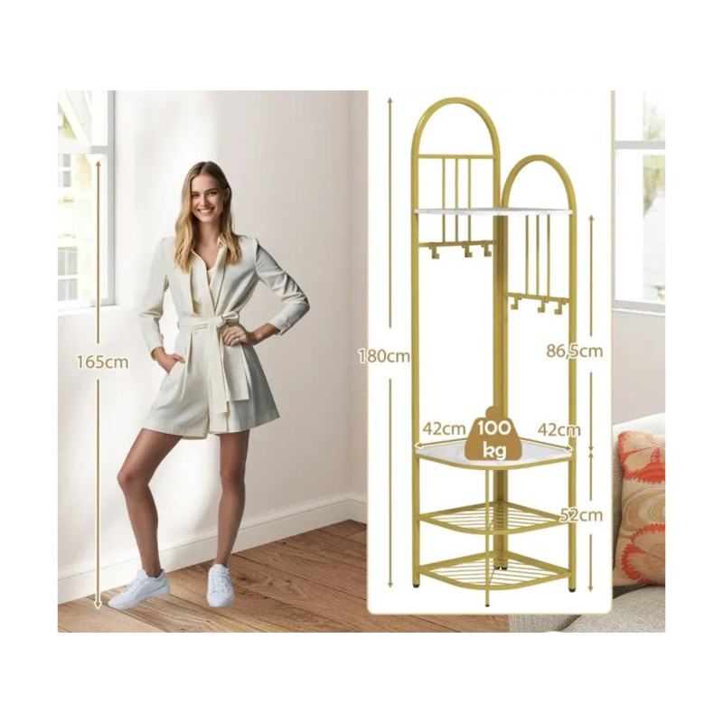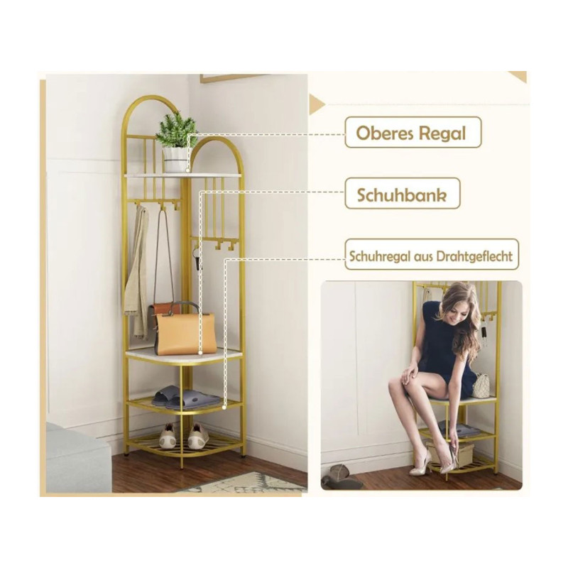 Náš multifunkční rohový věšák na kabáty je skvělou volbou pro optimalizaci prostoru ve vaší domácnosti. Jeho rohový design šetří místo a zároveň zachovává stylový vzhled. Tento všestranný kus nábytku kombinuje funkce věšáku na kabáty , botníku a věšáku na doplňky.