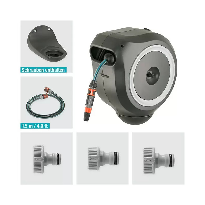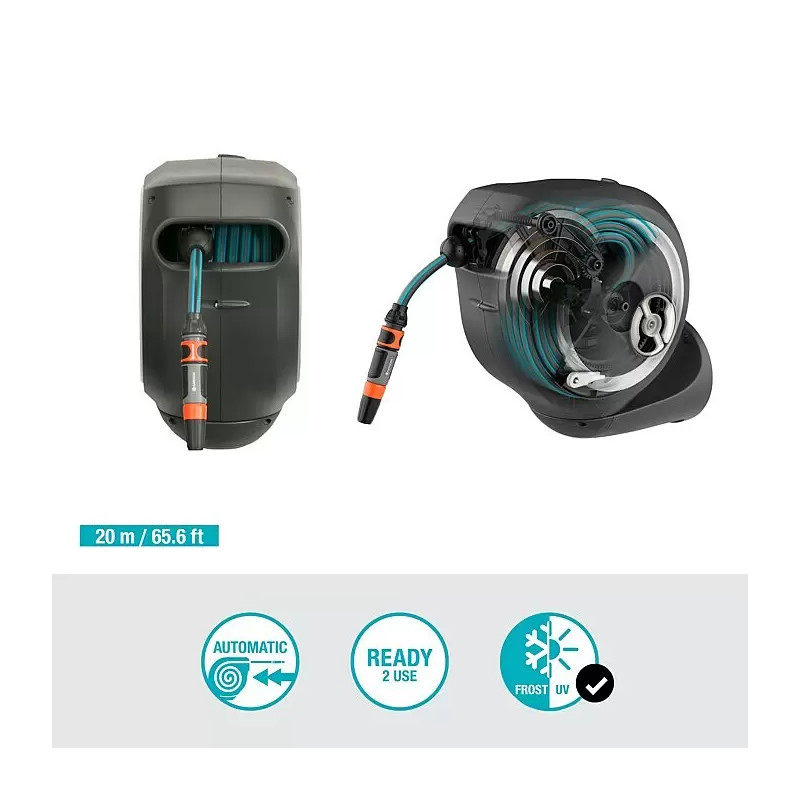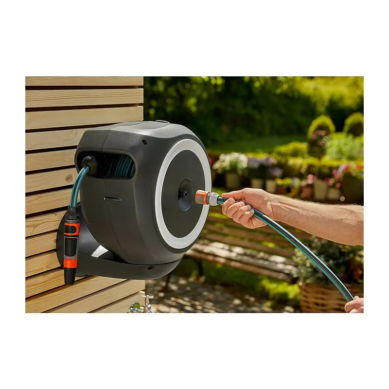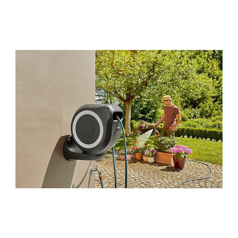 Kompaktní box na hadici se jednoduše připevní na jakoukoli zeď a je okamžitě připraven k použití. Praktický nástěnný držák lze otočit o více než 180° , takže se hadice při zavlažování nezalamuje a každý kout zahrady lze zalévat bez námahy. Pro zavlažování jednoduše vytáhněte zahradní hadici do maximální vzdálenosti 20 metrů . Díky praktickému zajišťovacímu mechanismu se hadice automaticky zafixuje v požadované délce.