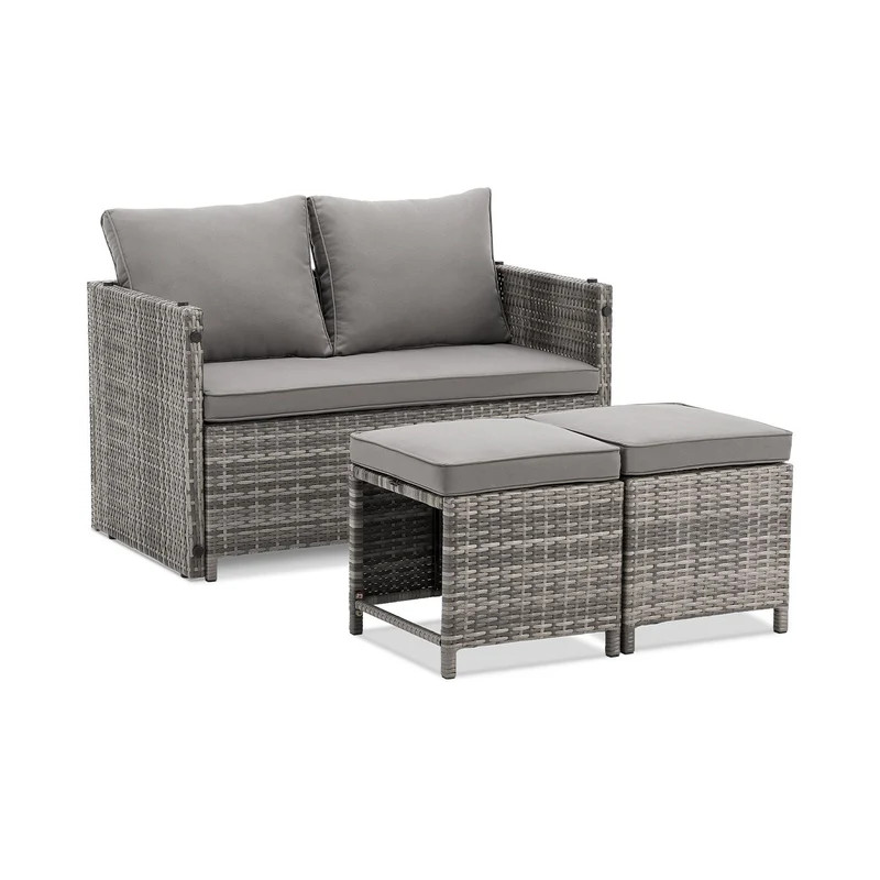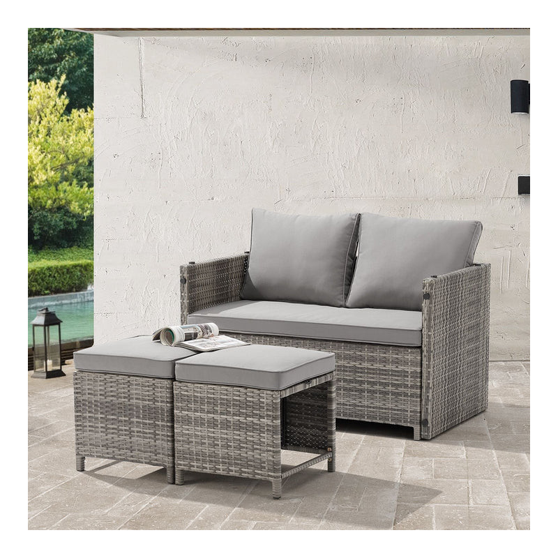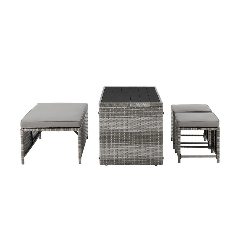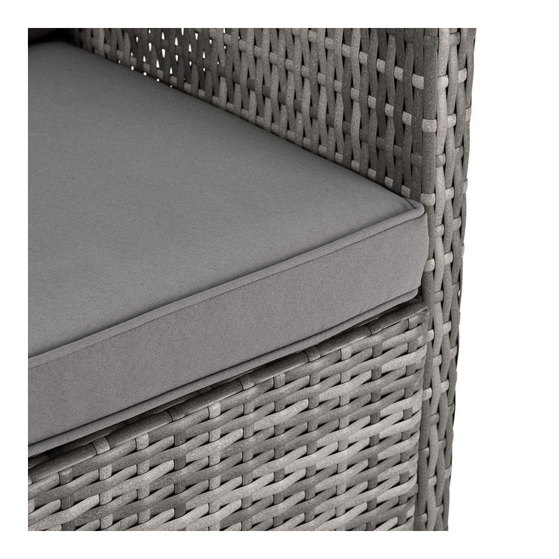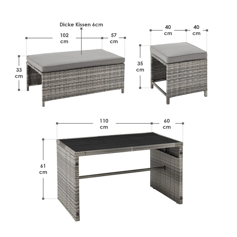 Sada 2 v 1 relaxačního zahradního nábytku Jamaica z polyratanu v šedé barvě se skládá ze stolu, lavice a stoličk. Sadu můžete použít buď jako pohodlnou pohovku, nebo jako posezení se stolem. Pohovka po otočení o 90 stupňů slouží zároveň jako lavice a stůl. Tato multifunkční sedací souprava pro 2 až 4 osoby je vhodná zejména do míst s omezeným prostorem, například na malý balkon, na zahradu nebo při kempování.