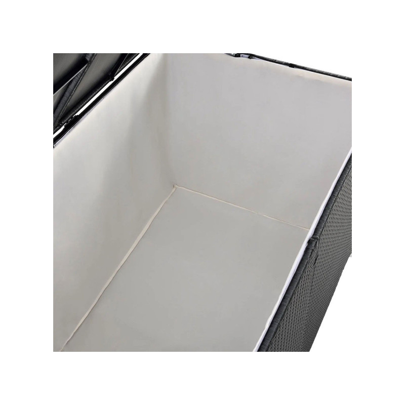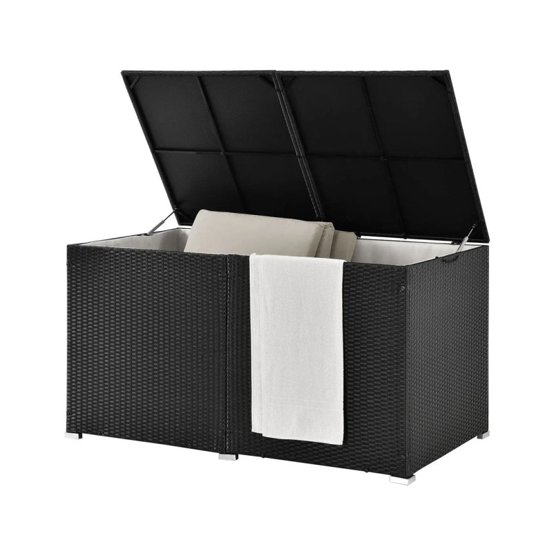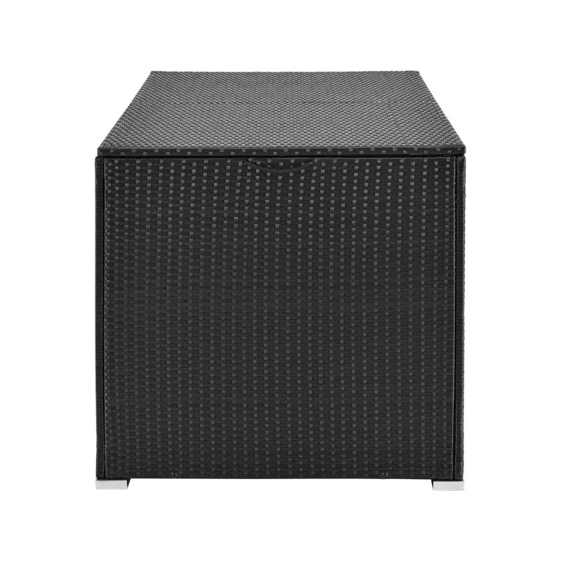 Polyratanový úložný box na zahradní nábytek Ikaria (objem 950 l, černý) nabízí perfektní úložný prostor pro vaše zahradní věci. Do zahradního truhlíku přehledně ukládejte polštářky, podsedáky nebo dětské hračky.