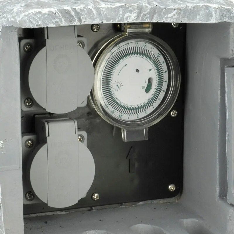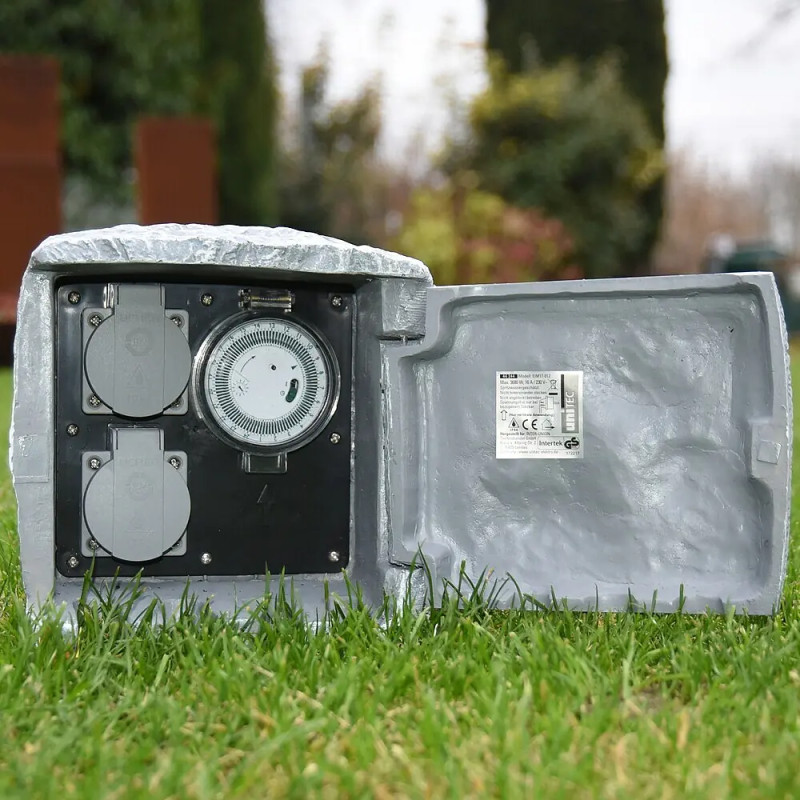 Rozvaděč zásuvek Unitec s kamenným vzhledem se dvěma bezpečnostními zásuvkami (s výklopným víkem) a časovačem je skrytý systém rozvodu energie pro zahradu, který diskrétně splývá s krajinou. Má robustní pryskyřičné pouzdro a lze jej použít v teplotách od -15 °C do +40 °C.