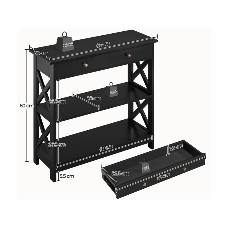 Úložný regál s robustní kovovou konstrukcí má dobrou stabilitu. Každý oddíl má nosnost 150 kg. 5 polic vyrobených z MDF panelů, které ladí s kovovou konstrukcí.