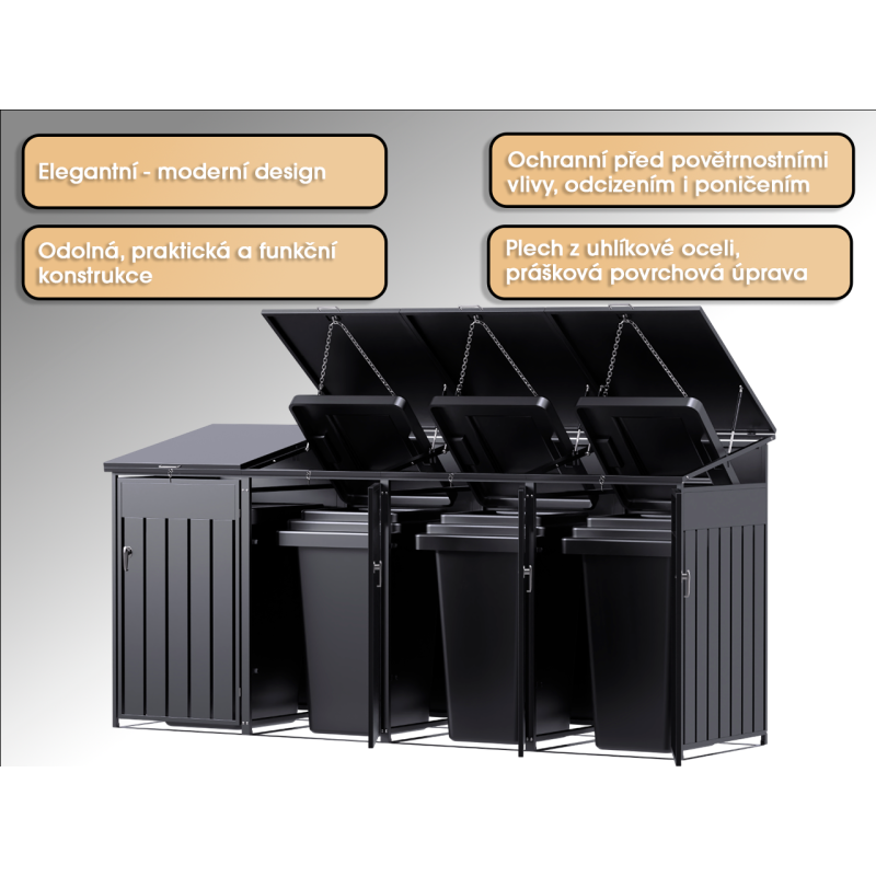 Ilustrativní příklady rozdělení stavů produktůPřístřešek na popelnice D04GW3, na 3 popelnice, celokovový kryt, moderní, antracit/hnědý