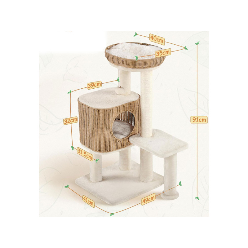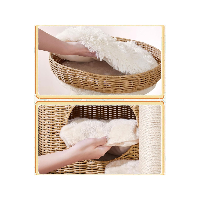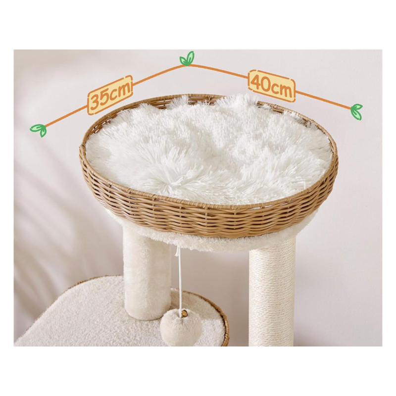 Tento jedinečný kočičí strom je vyroben z dřevotřísky, plyšové tkaniny a krysí vazby. Skládá se z kulatého lehátka, pevného škrabadla, závěsného plyšového míče, košíku pro kočky a stabilní základny. Útulnost zajišťují dvě plyšové podložky v lehátku a v košíku pro kočky.